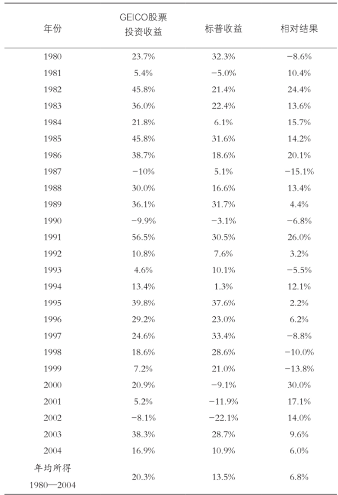 辛普森践行集中投资的成效极为显著:2004年,巴菲特在致股东的信中披露,1980年至2004年的25年间,GEICO投资业务的年均回报率达20.3%,是同期标普500指数回报率的1.5倍。